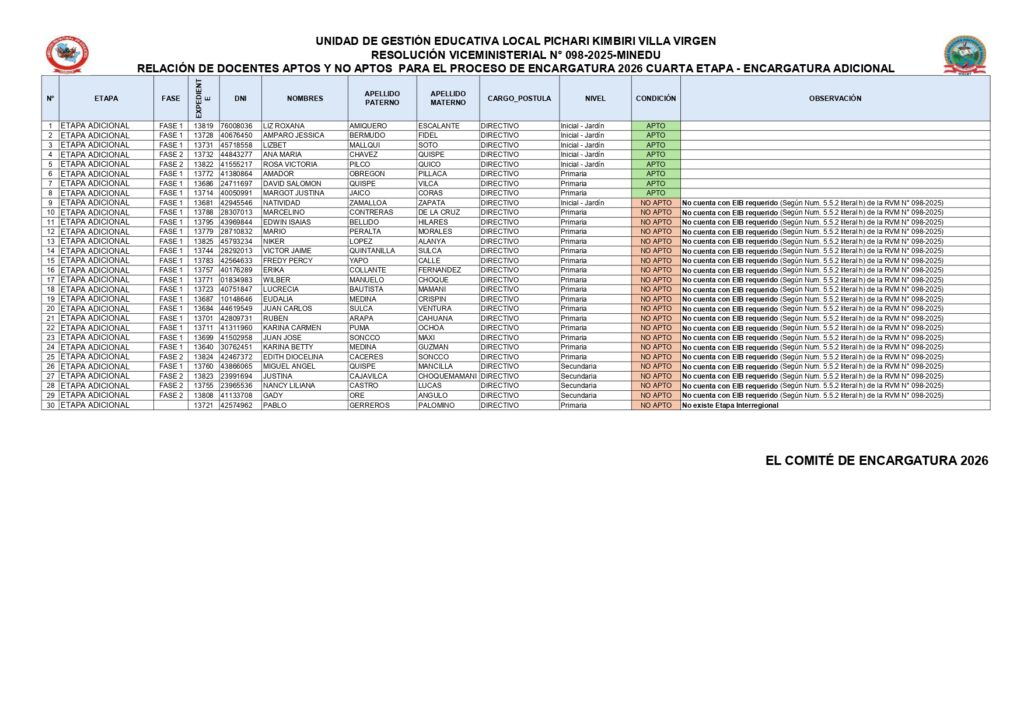 Comunicados RELACIÓN DE DOCENTES APTOS Y NO APTOS PARA EL PROCESO DE ENCARGATURA 2026 CUARTA ETAPA – ENCARGATURA ADICIONAL Dic 15, 2025 0 Comment